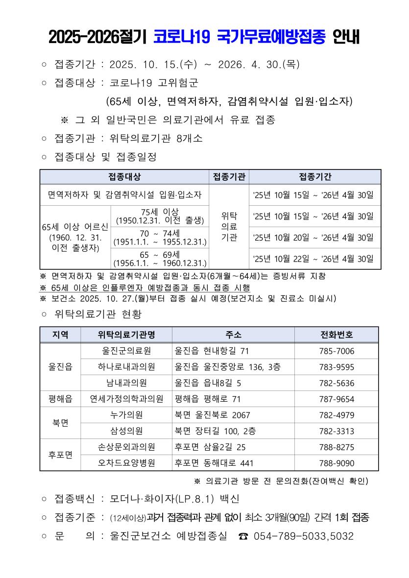 2025-2026절기 코로나19 국가무료예방접종 안내 페이지 정보 작성자 최고관리자 댓글 0건 조회 27회 작성일 25-10-13 16:44 본문 - 목록 이전글 왕피천공원 추석 이벤트 안내 다음글 울진군장애인체육회 홈페이지 이용 안내 댓글목록 댓글목록 등록된 댓글이 없습니다.